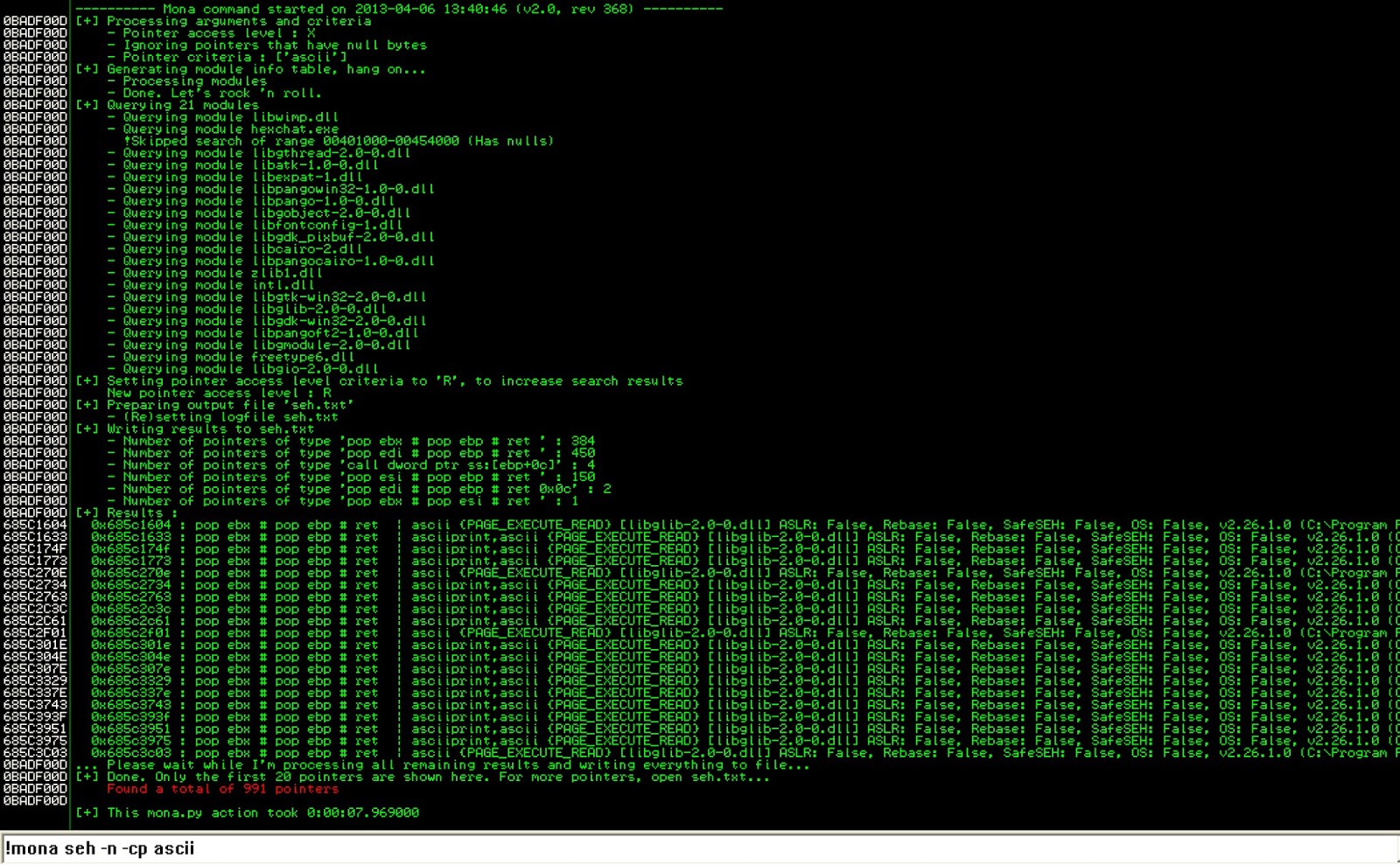 Finding a valid pop-pop-ret instruction became a bit difficult, because I started to find out that HexChat would pretty much only use ASCII characters. Luckily, Mona.py had me covered, and can search for filtered characters: