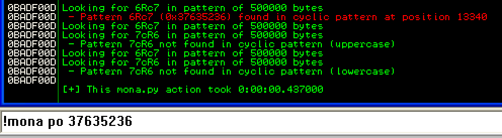 Indeed, I had overwritten the SEH handler with “37635236”. I then ran mona’s pattern_offset to find the offset of the string that would overwrite the SEH handler.