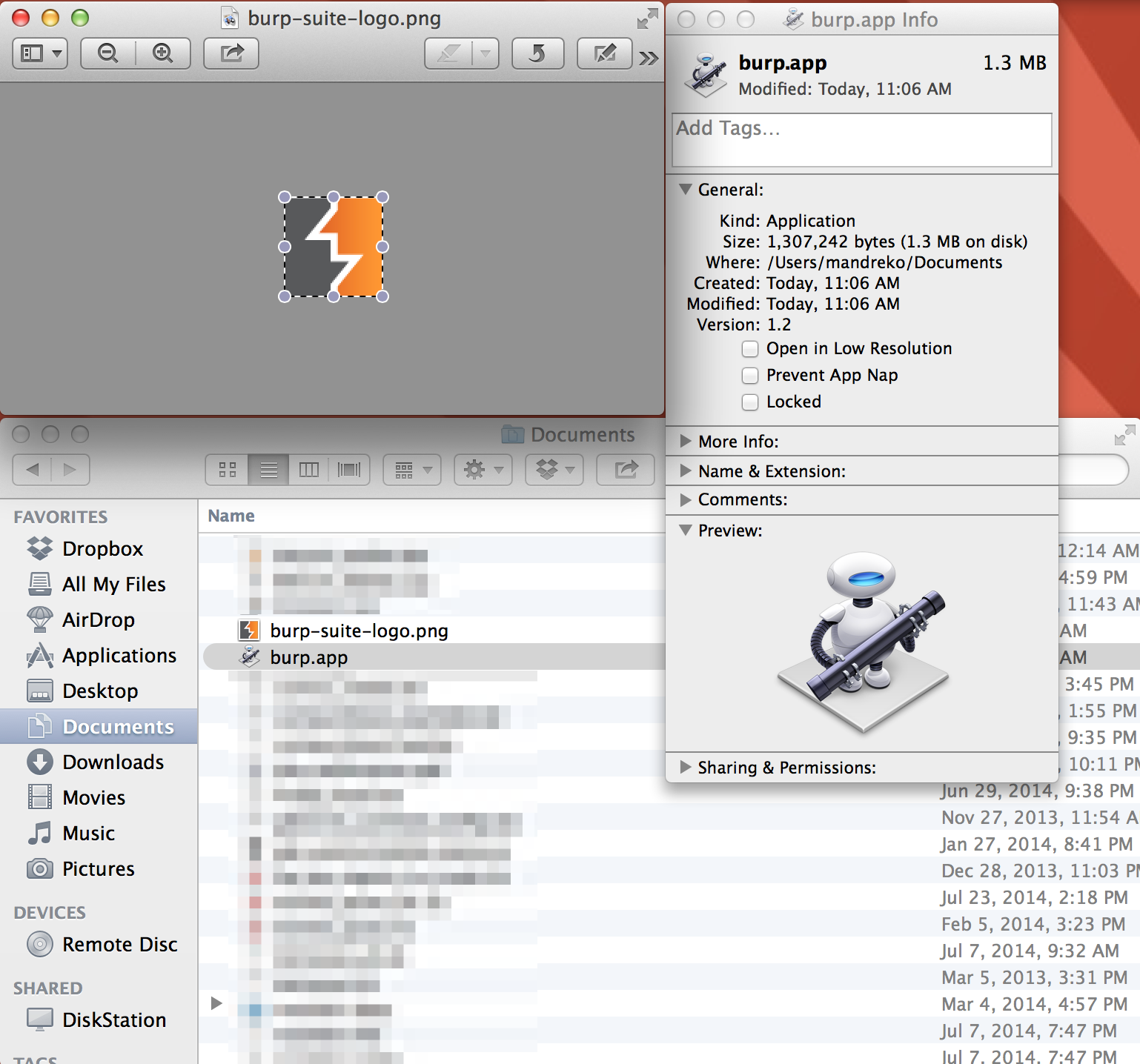 Close out of the info screen and the Preview app, and you should see the new icon reflected in Finder. From there, you can drag the “burp.app” file into your Mac OS X Dock, and launch the newest version of Burp without having to remember the command arguments, or opening a shell and pasting in commands.