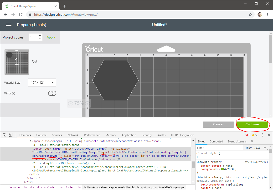 I noticed that the site was written in Angular, which uses the idea of controllers to keep state of the UI. When I inspected the free “Continue” button, I saw that it called the “go()” function on the “ctrlMatFooter” controller.