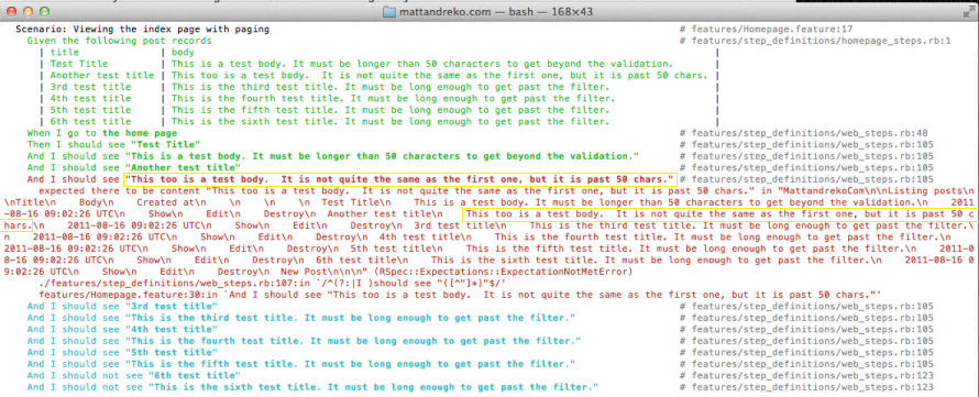 I’ve slightly outlined the relevant data in yellow. I went back, and copy/pasted the data from the creation from my factories, to the expectation of text. It still gave the same error. I was dumbfounded, as I can clearly see the exact same text in my “And I should see” as well as the actual results.