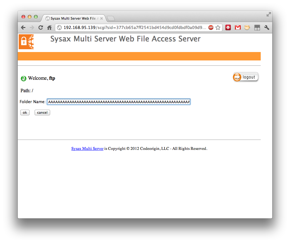 I have discovered a bug in the Sysax Multi-Server application. More specifically, it’s in the HTTP File Server service, which is not enabled by default. It has to be turned on by the admin for this exploit to properly function. The user in question also needs permission to create a directory.