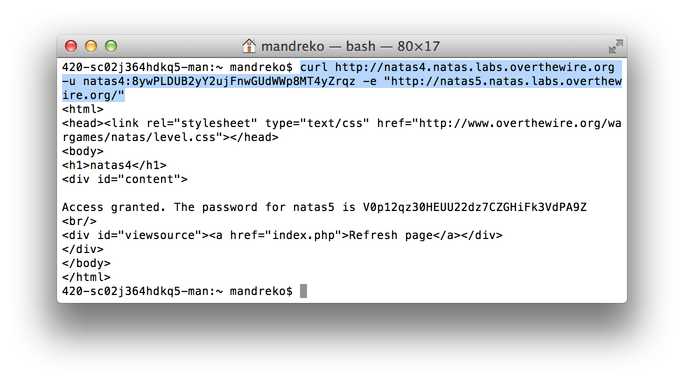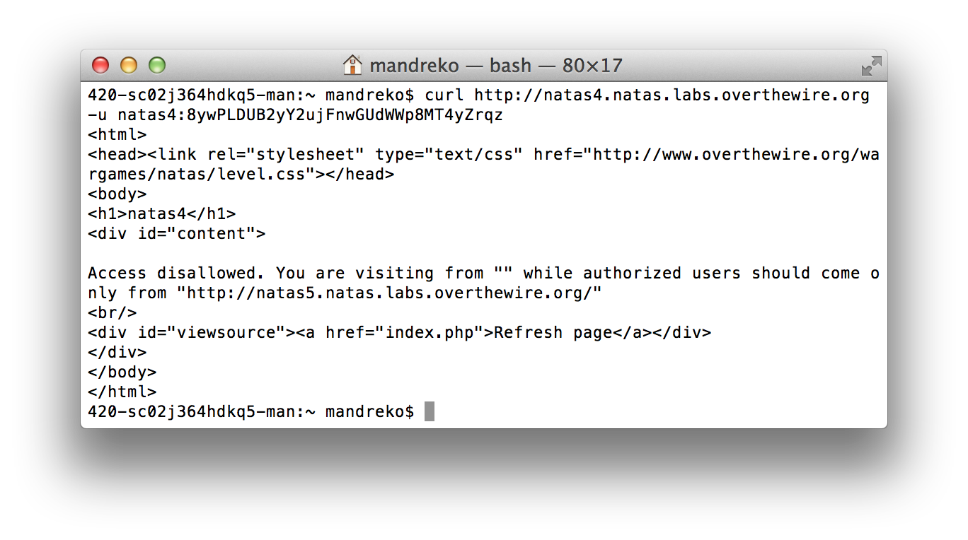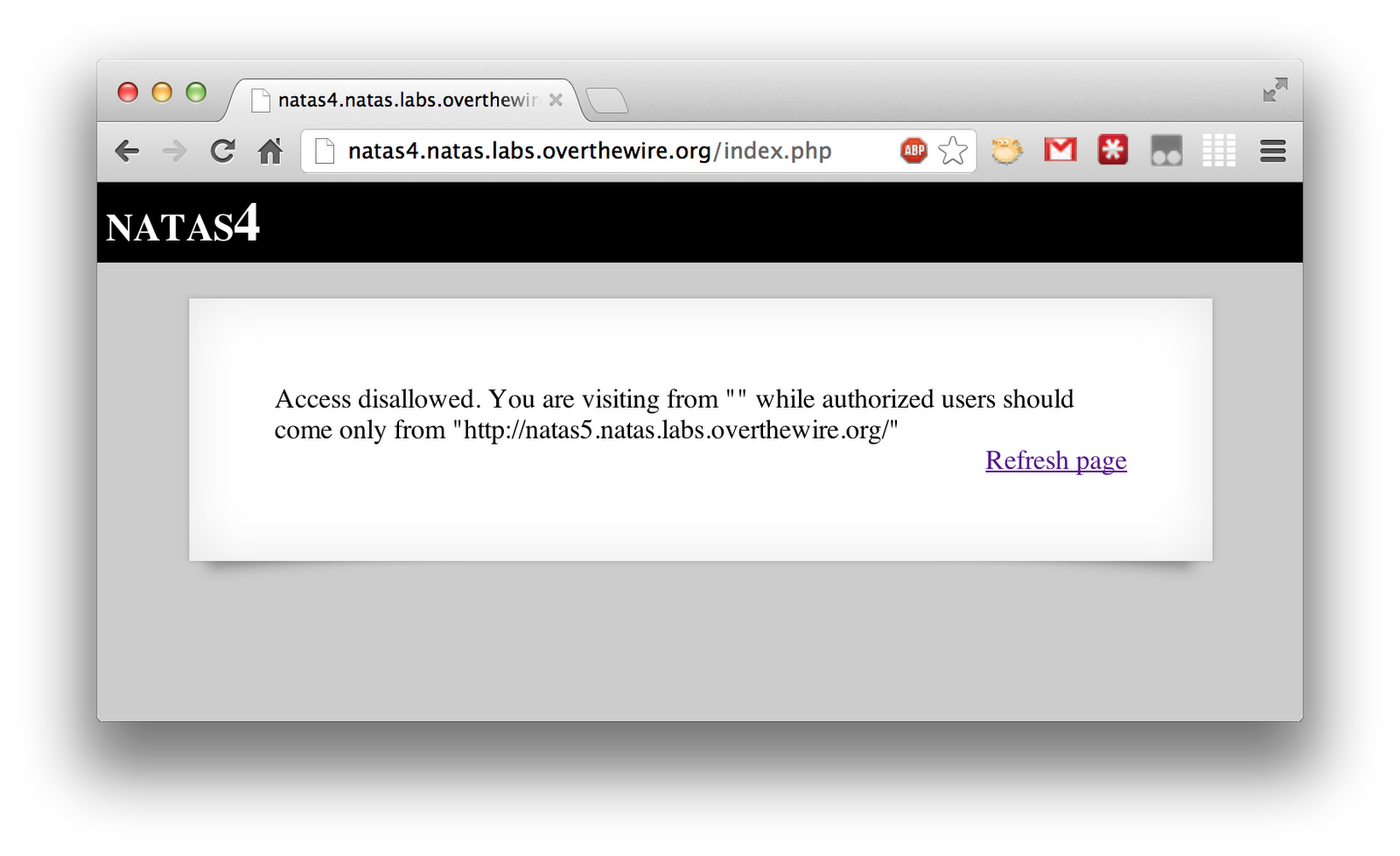 Level 4 of OverTheWire’s Natas wargame starts a little different than the previous levels. It immediately presents you with an error message.