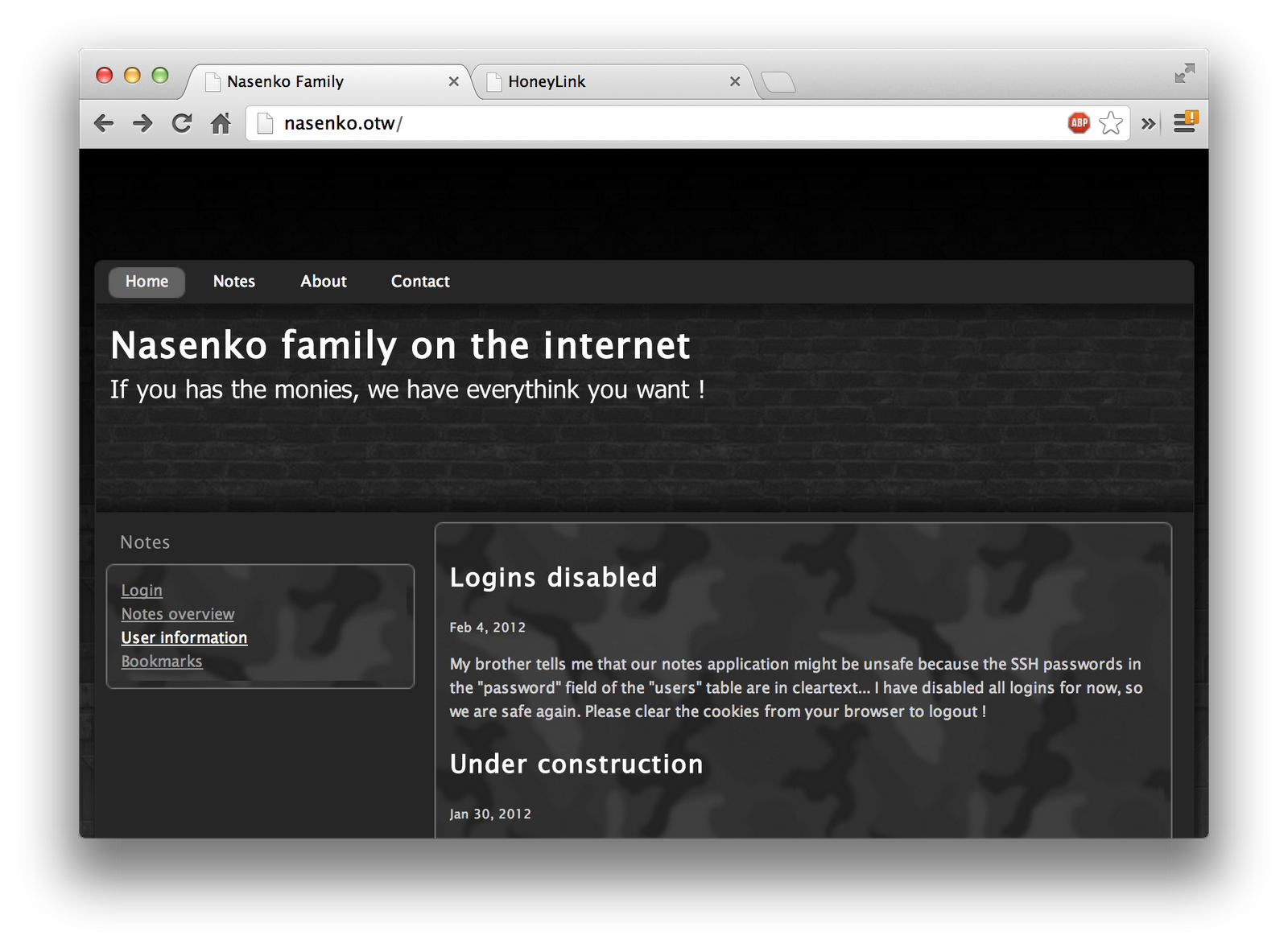 After poking around a bit, I found that you are unable to access the Notes service, since you’re not logged in. Per the blog article on the main page, login attempts are disabled. On the Bookmarks page, it says that the submitted bookmarks are being visited routinely. These two statements combined immediately made me think of using a Session Hijacking attack to steal the session of the user already logged in, checking the submitted bookmarks.