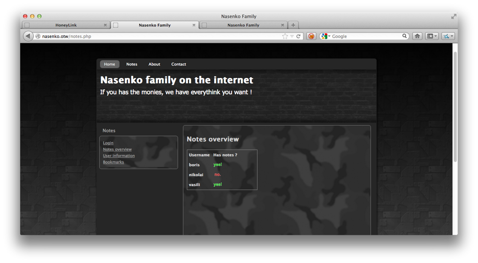 - The Nasenko home page. This is what appears to be the main application that we are attacking. It has a Bookmark Service, and the Notes service, which were referenced in the PDF, immediately visible.