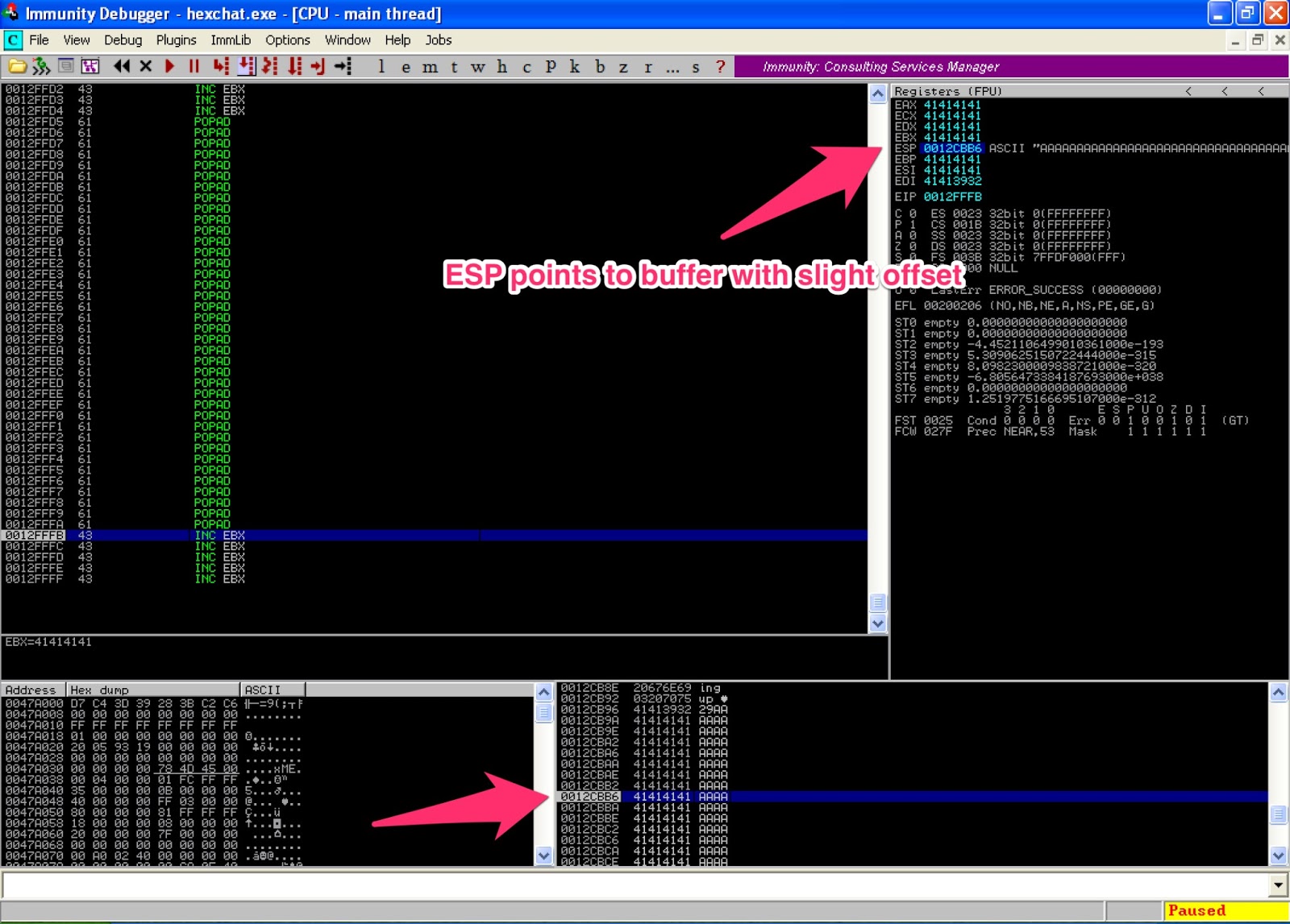 After a couple days of thinking, I thought about using a fairly non-traditional method to exploit this. In the stack, way down, was a pointer to the beginning of the buffer I sent into HexChat. I was able to use the POPAD instruction to get rid of several ESP values at once, since it’s Opcode was an ASCII character. By combining 38 POPAD instructions, I was able to get to the pointer in memory, and still have 5 bytes of memory to try to load it. My exploit-stub ended up looking like this: