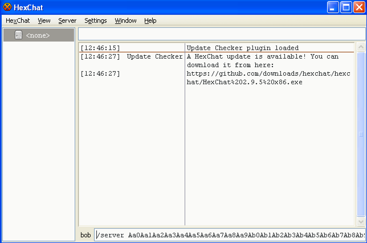 A buddy of mine, Mulitia, and I were talking about 0-days, and he mentioned finding one in Hex-Chat, a popular IRC client. It was super low severity, but still neat. If you entered “/server " followed by 20,000 random characters, the application died. I decided to try to make a working exploit out of this for fun.