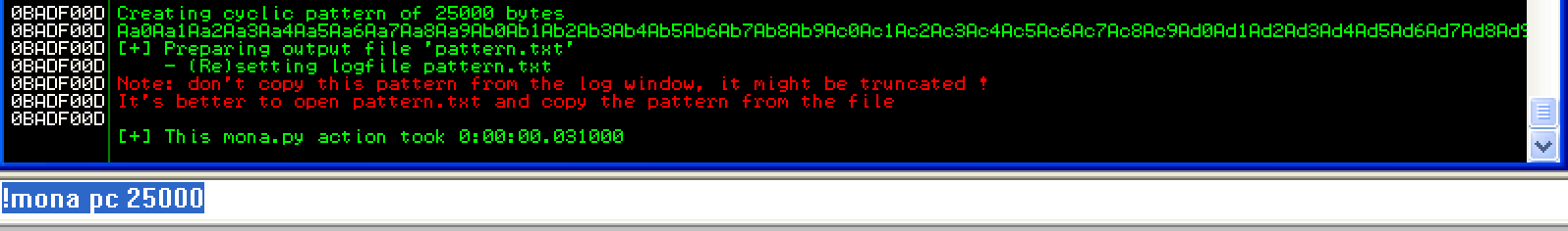 First thing’s first, when developing an exploit, you need to have the offset of the buffer so you know where to put executable statements. By using the pattern_create functionality of Mona.py, I made a 25,000 line unique string, and ran it into the program while attached to a debugger.