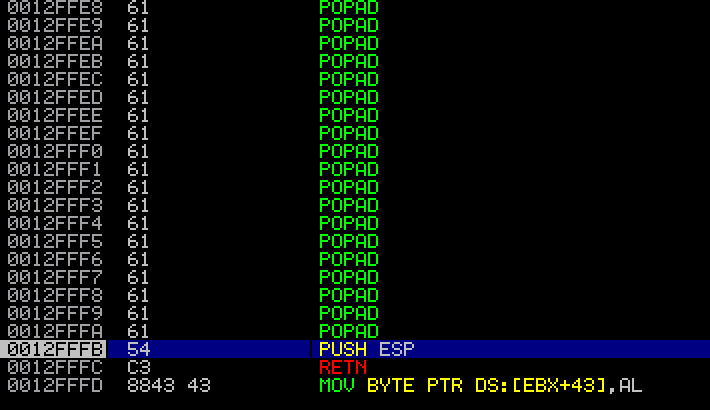 I ran the exploit stub, followed the pop-pop-ret and then the jump, and found myself in memory that I controlled. That was the good news. Unfortunately, the bad news was that I only had a very limited amount of space to put any payload (43 bytes). My first thought was to use an egghunter, however egghunters had non-ascii characters in them, and when encoded properly, were well over 43 bytes long. This left me thinking for a good while.