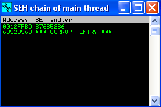 Since an exception was raised, I checked the SEH window, to see if I had overwritten the SEH handler.