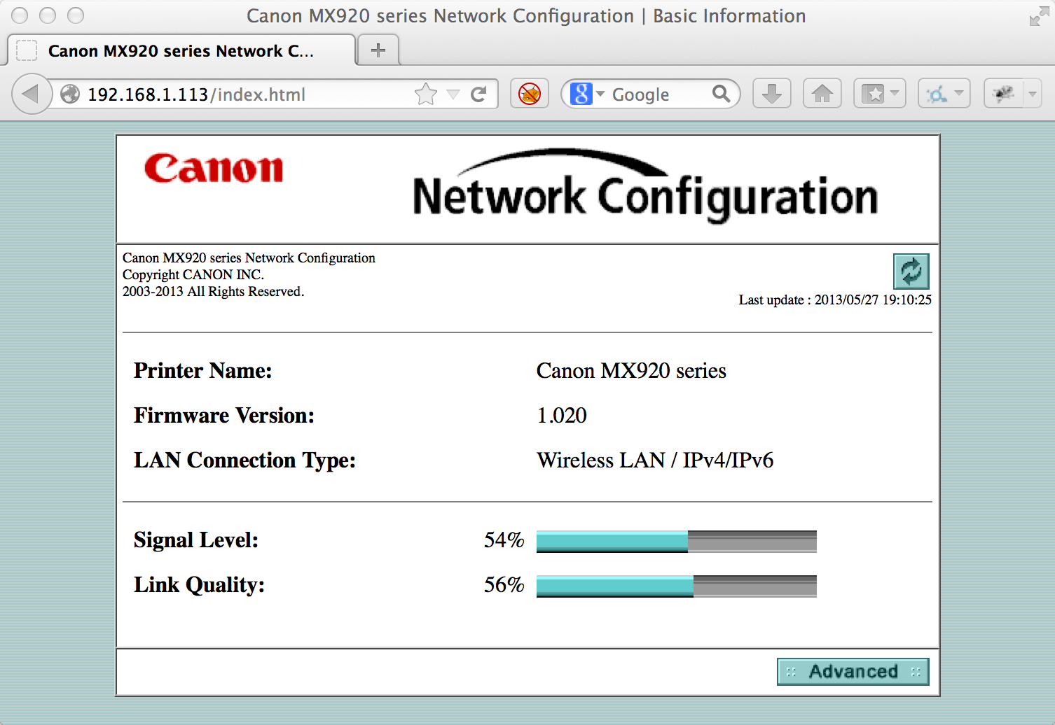 I then figured I’d look at some of the more advanced settings, so I clicked the “Advanced” link. This brought me to a control panel for the printer. I saw a bunch of information, and was surprised that I had not entered any credentials. I figured maybe the status page would be anonymous, but surely I’d need some password to access the management pages. But then again, I hadn’t used any password when setting up the printer using the LCD.