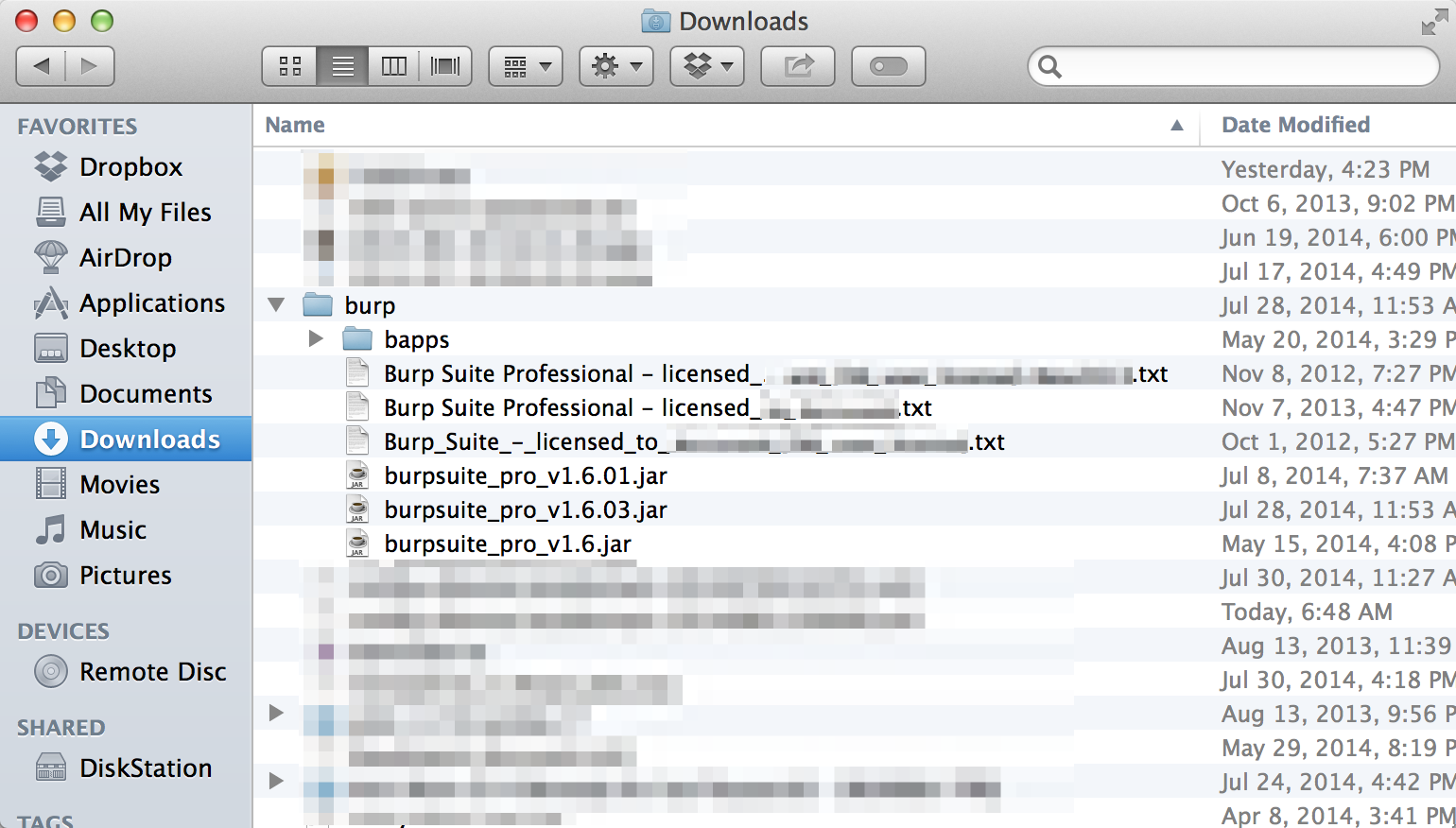So first, to describe my configuration, I keep the Burp Suite jar files in my ‘~/Downloads/burp/’ folder, as shown here: