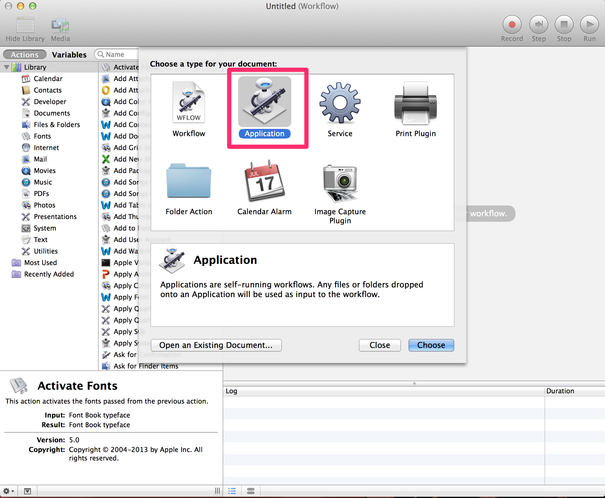 First, open Automator, which comes with Mac OS X (found in Applications or with Command-Space). It should open up prompting you to make a new Automator file, and you want to select an “Application”, so you can run it as if it were a true native application. The screen should look like this: