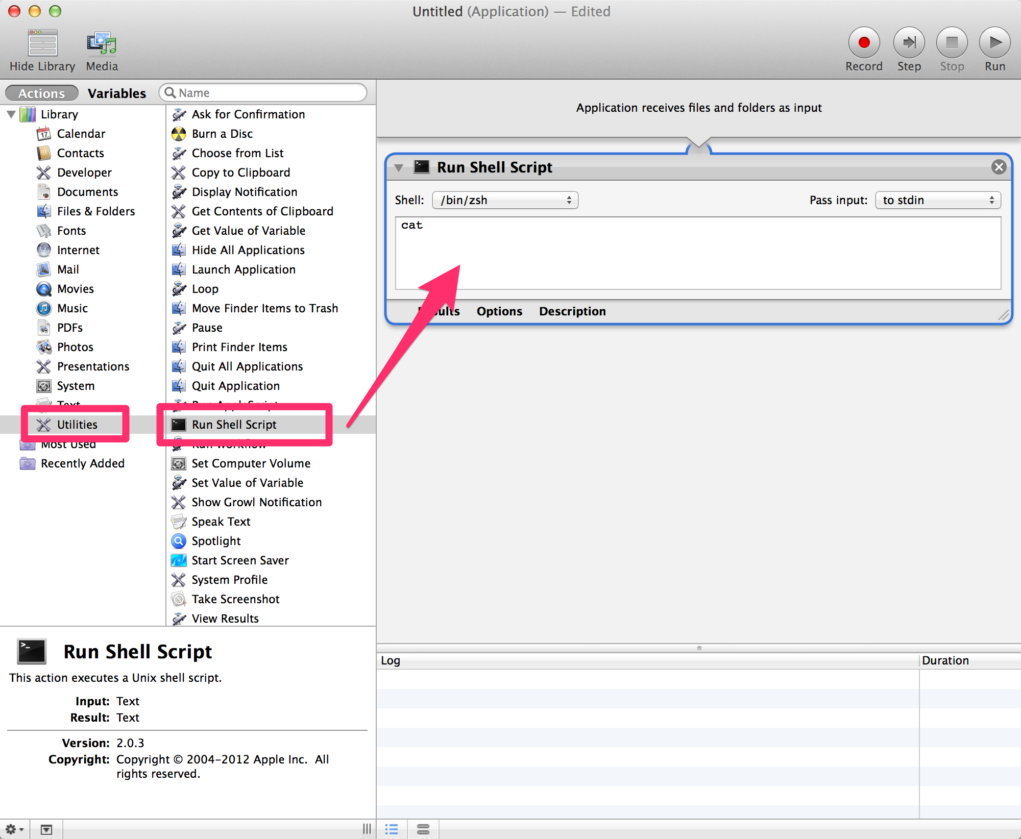 Automator will let you do a lot of things, but what we want is fairly minimal. Apple has some decent documentation on it as well, if you want to do something more basic. However, for our purposes, select the “Utilities” section, and find “Run Shell Script”. Double-click on it, and you’ll see it add an entry to the main window, like this: