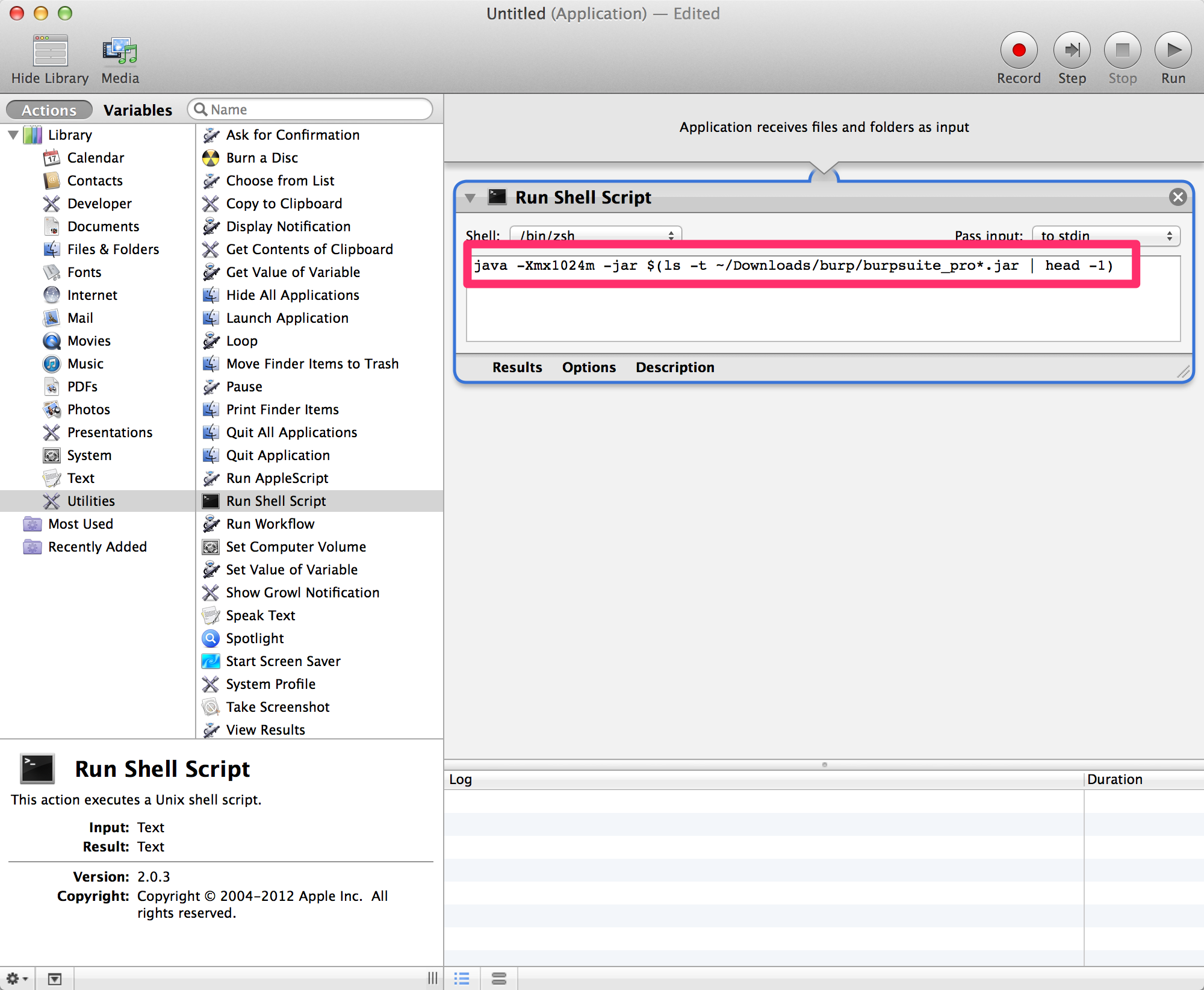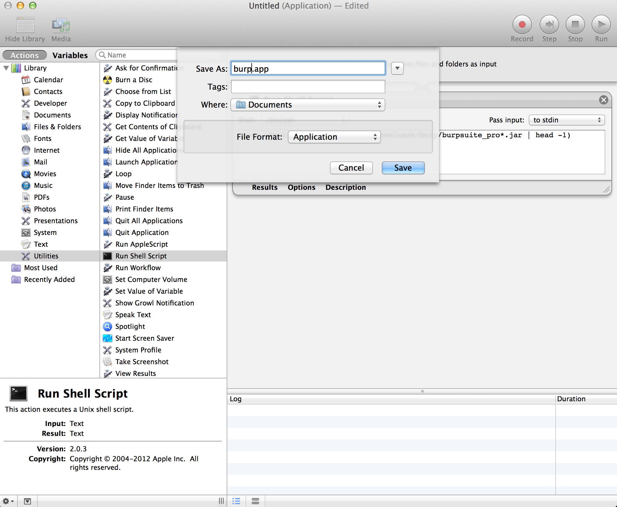 So the next issue I had, was that I could put this application in my Mac OS X dock, but it had the icon for Automator, instead of Burp Suite, which makes it harder to identify, especially if this method is used for multiple applications. I went out to Google Images and searched for “Burp Suite logo”, and found an appropriate png, and saved it to my “~/Documents” folder, next to the “burp.app” we made previously.