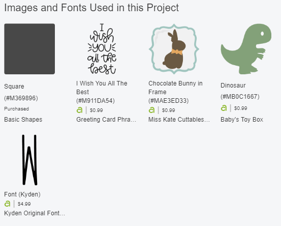 You can see that this is broken down into multiple items. In this example, there’s a $0.99 dinosaur shape, a $0.99 bunny shape, a $0.99 greeting card phrase, and a $4.99 font.