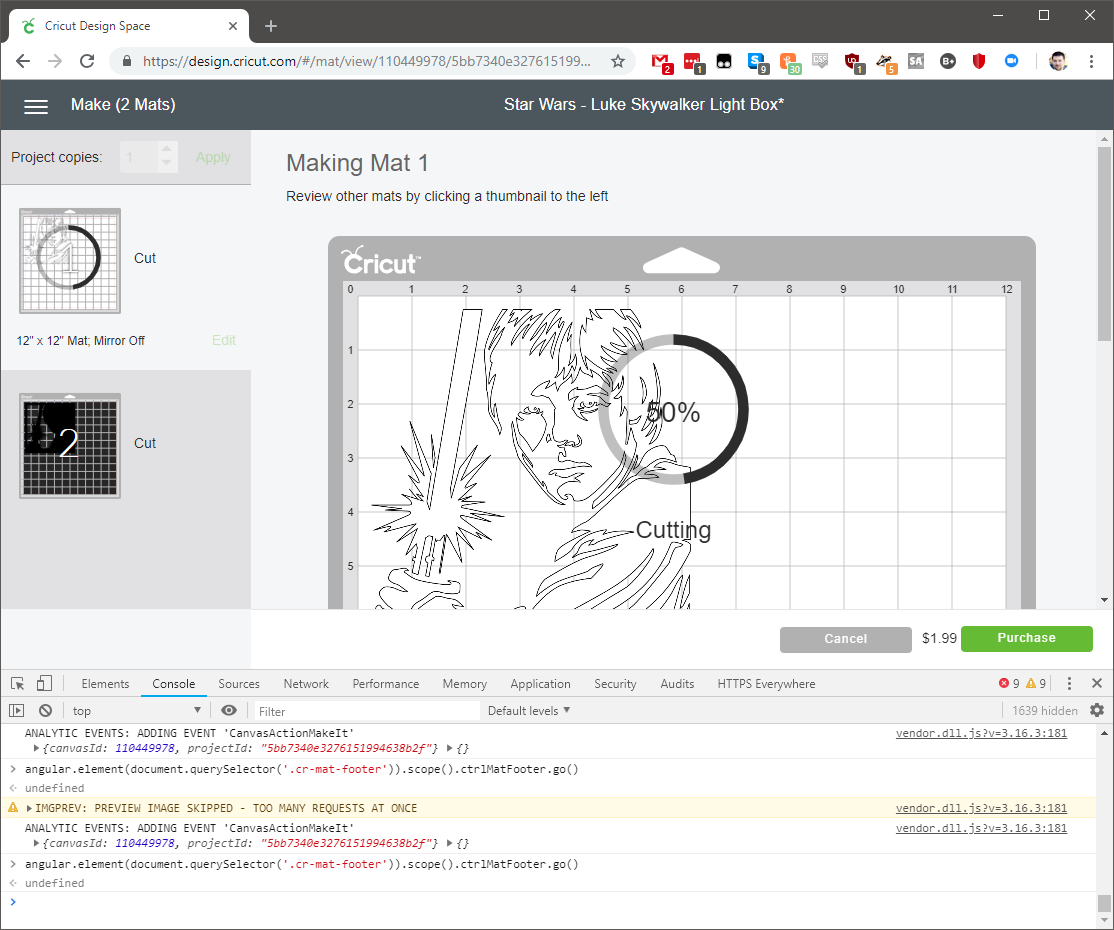 When I went to actually make the cutout, you can see that where normally you sould see a “Continue” button, there was now a “Purchase” one instead.