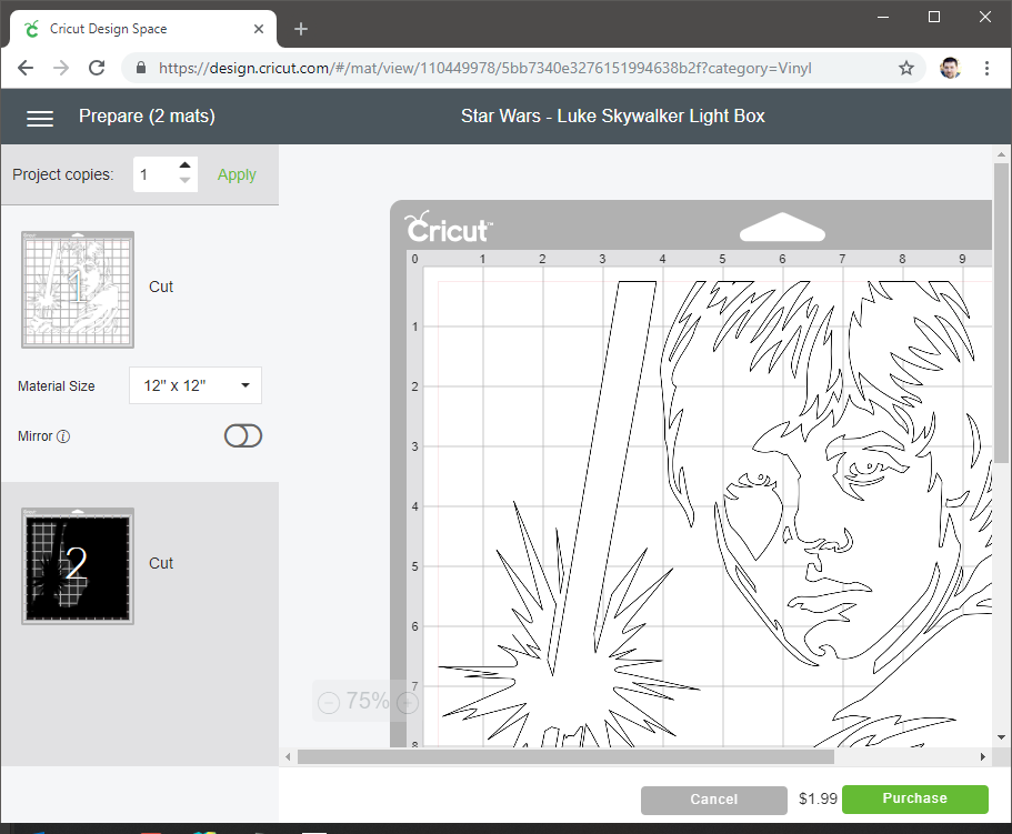 I started by choosing a project that would require payment. This Luke Skywalker vinyl cutout would do nicely.