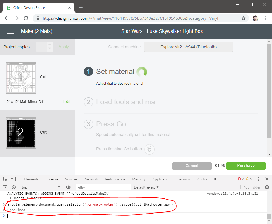 The issue was simply that the Cricut Designer assumed that the “Purchase” dialog would only be closed if a purchase was actually made. There was no validation in the “go()” method to ensure that all the designs were owned before actually sending it to the device.