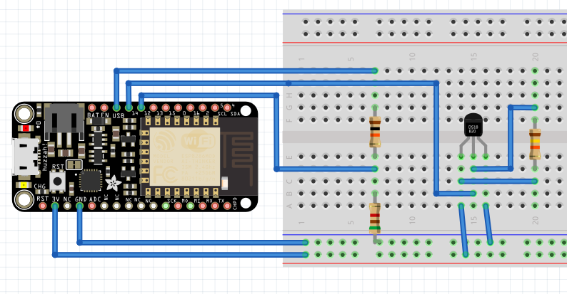 I wired it up on a breadboard, using some pull-down resistors, which are required for the DS18B20. Some of the ones I found on ebay and Amazon have them built-in, so check and see. Mine did not, so you will see them on the circuit design.