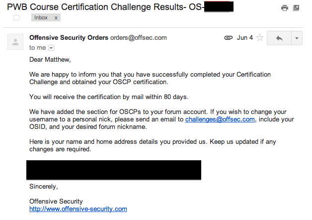 As I posted previously, I was taking the PWB course from Offensive Security. I am happy to report that I passed with flying colors (100%)!